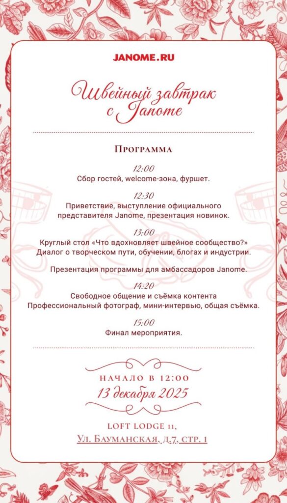 13 декабря состоится «Швейный завтрак с Janome» в Москве. Такое мероприятие устраивается впервые.