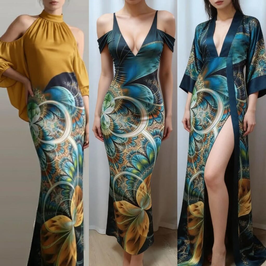 Вот несколько моделей из итальянского шёлка с дизайнерским принтом ,которые я придумала, а ИИ нарисовал и оживил 😃